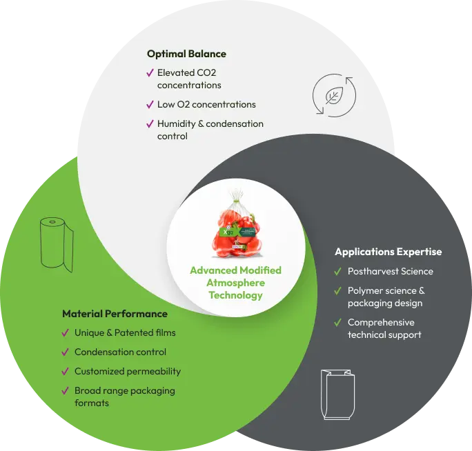 Our patented modified atmosphere (MA) and modified humidity (MH) films do what standard packaging cannot — control both gas composition and moisture levels to slow down aging and ripening processes, inhibit microbial decay and maintain quality. With decades of combined postharvest experience across 60+ produce types, we engineer solutions tailored to your specific produce needs. The result: demonstrably longer shelf life, better quality for your customers, reduced supply chain waste, and the confidence to reach distant markets in prime condition.