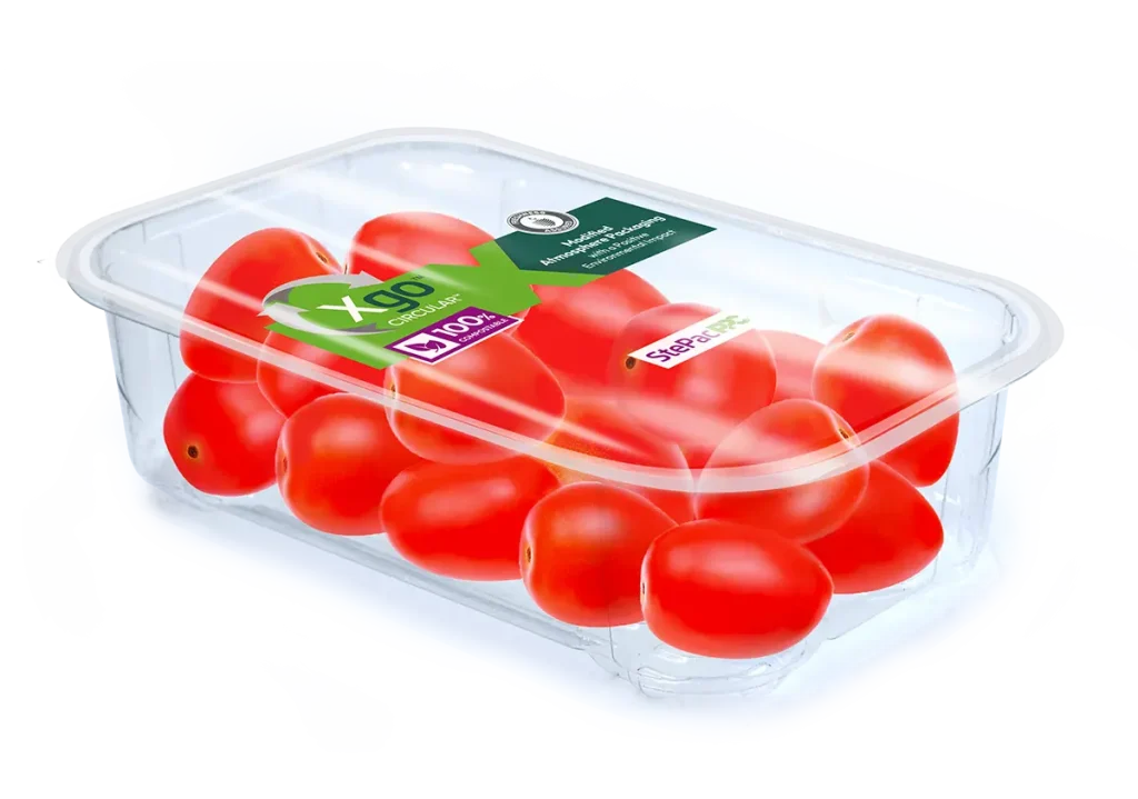 StePacPPC Xgo™ modified atmosphere lidding film packaging solutions are laser perforated and when sealed to the tray containing the tomatoes, provide a hermetic environment, enhancing food safety. The unique properties of the film help minimize dehydration and shrivelling, maintain firmness and reduce the risk of microbial decay, thereby extending shelf life.